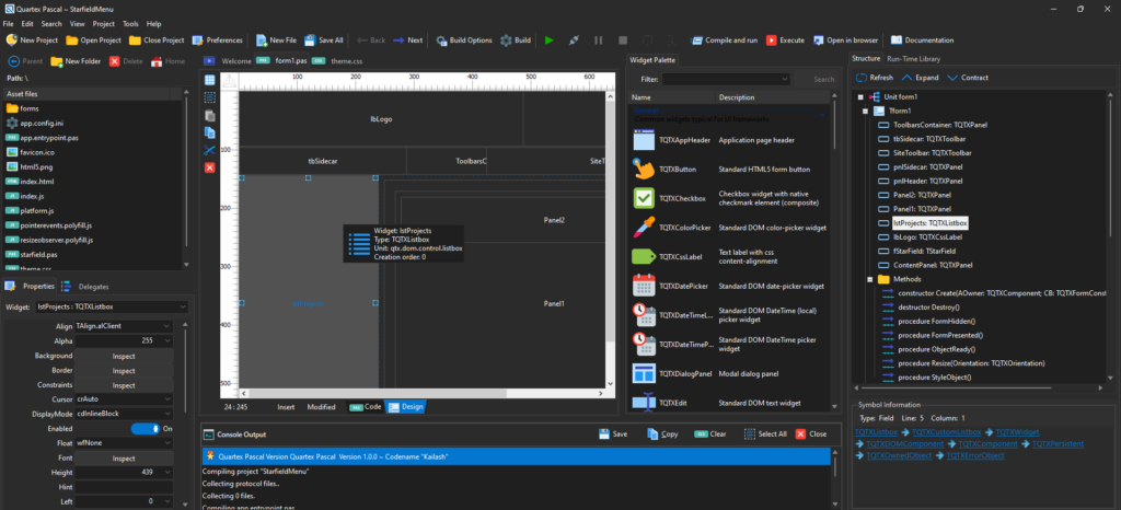 Quartex Pascal (short: QTX) is an object pascal IDE, compiler, run-time library and development system. Unlike traditional, native development systems, such as C/C++, Delphi or Freepascal, QTX generates high performance JavaScript – allowing developers to tap into web technology and enjoy the full might of modern mobile, desktop and server development.