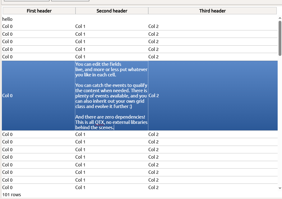Inheriting from TQTXTable, TQTXStringGrid takes it one step further and adds cell editing. Here you can double-click on a cell (or double tap if you are on a tablet or phone) to enter edit mode.