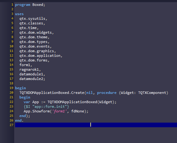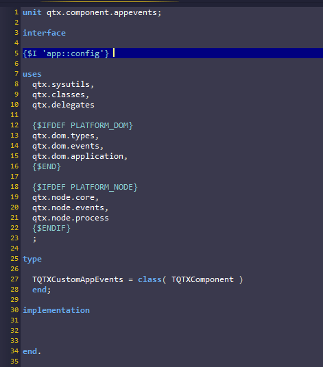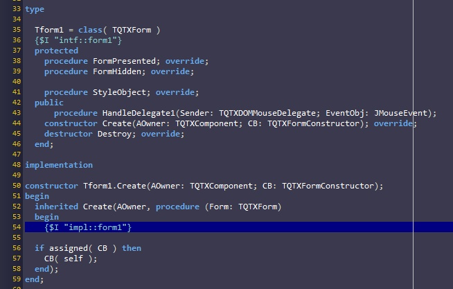 In QTX we have a few so-called ‘magic’ include files that the IDE and compiler generates on the fly. When you start out with QTX one of the first things you notice is that forms have a {$I “intf::form”} coupled with a {$I “impl::form”}, like you see below: