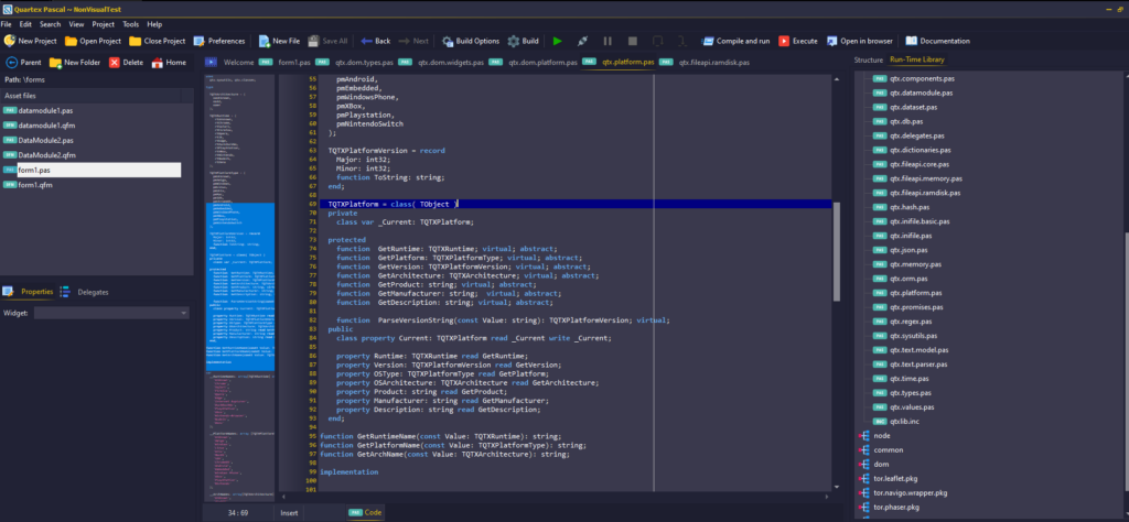 The only external dependency to the Quartex runtime library so far, has been platform.js. This is a tiny library that provides in-depth info about the browser. Things like operating system, version, the browser type and other useful tidbits. Well, that dependency is no more since we now have our own, pascal only version in the RTL!