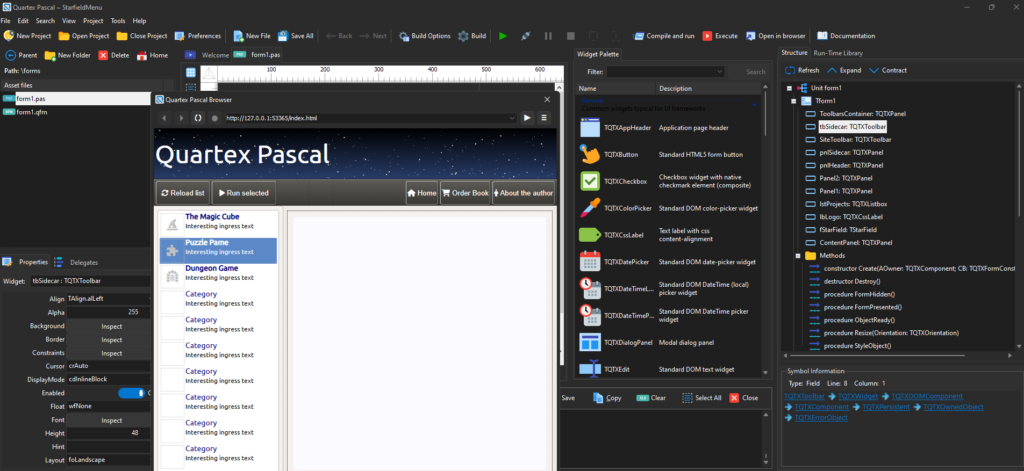 Just like Delphi’s TCustomControl our TQTXWidget can house as many child elements as you like. The way you create child widgets is identical to Delphi and Lazarus. And you can create as many child widgets as you like. Each widget supports all the layout options of HTML5, which makes it incredibly fun to create your own elaborate widgets. Widgets that can ble isolated in packages for distribution or sale.